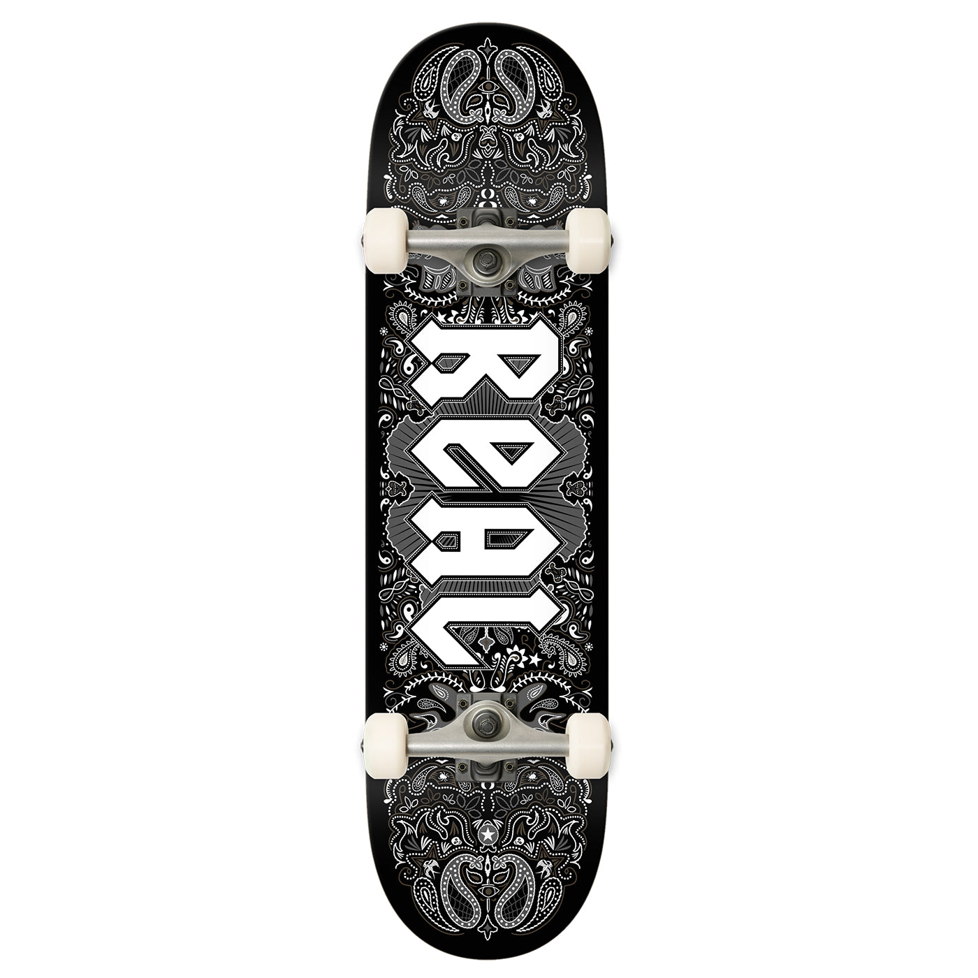 REAL COMPLETE BANDANA 8.5 X 32.2 - These Price Point Completes are great quality and value! A perfect board for Beginner to Intermediate Skates. Comes with Anchor Trucks and Branded Wheels.