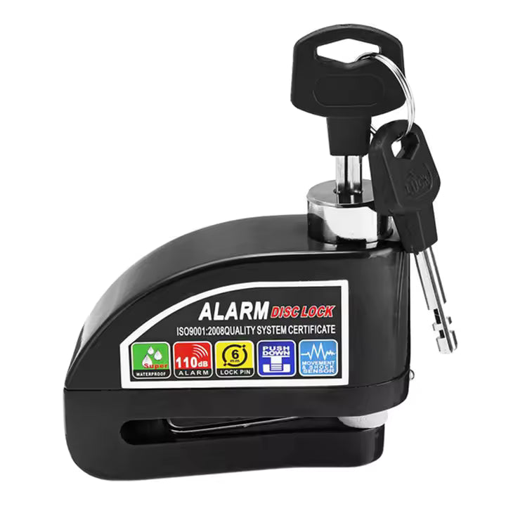- Disc Alarm Lock: this alarm disc lock built-in shock sensor is capable of detecting vibrations and movements. the 110db alarm system scares off the potential loss while at home or parking outside, handy for bikers when parking outdoors or at home