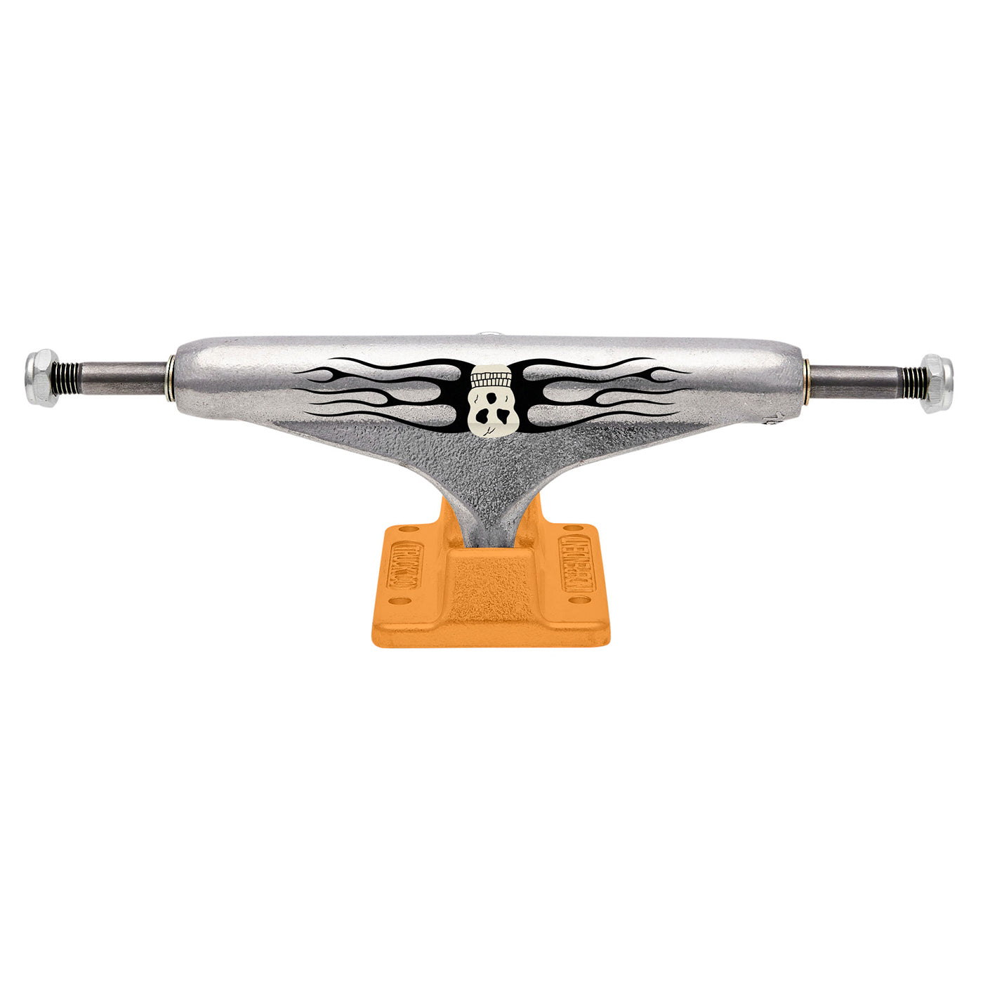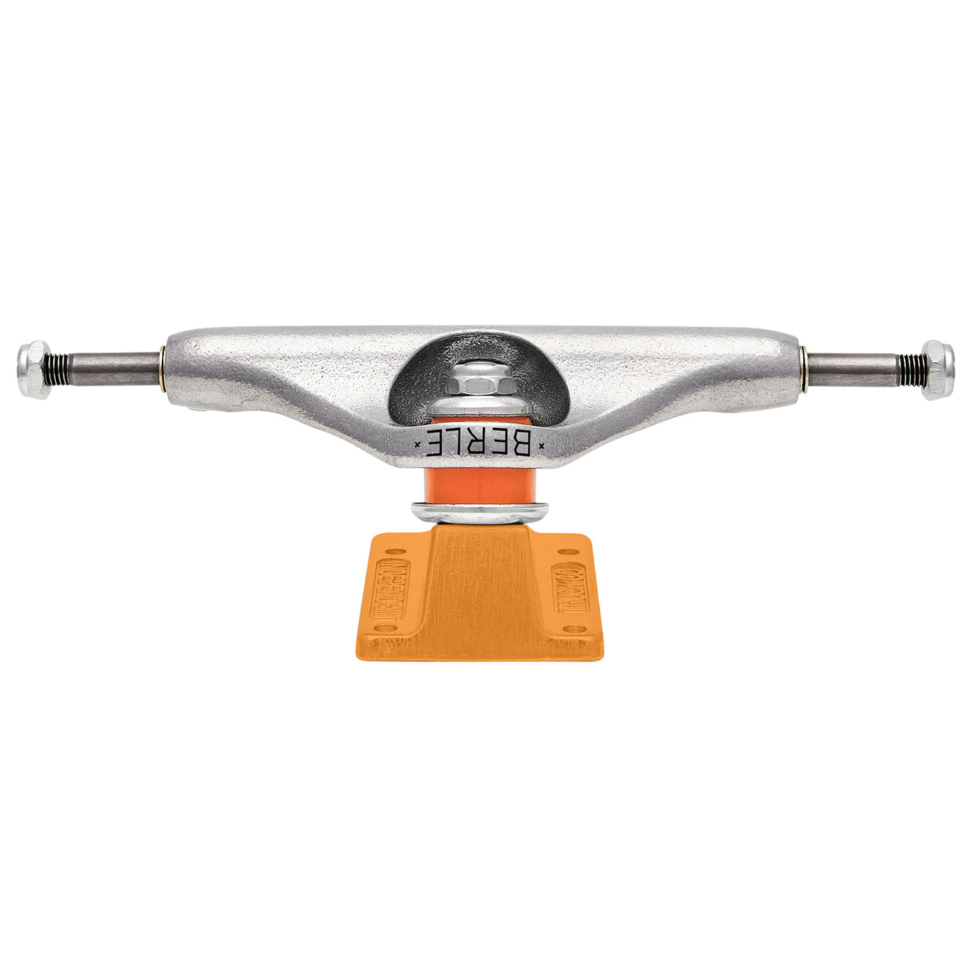 INDEPENDENT TRUCK STAGE 11 SKULL BERLE SILVER/ORANGE - Elijah Berle pro trucks. Pad printed art by Elijah. Pad printed 'BERLE' on yoke with polished silver hanger, flat orange baseplate, orange cushions & silver hardware
