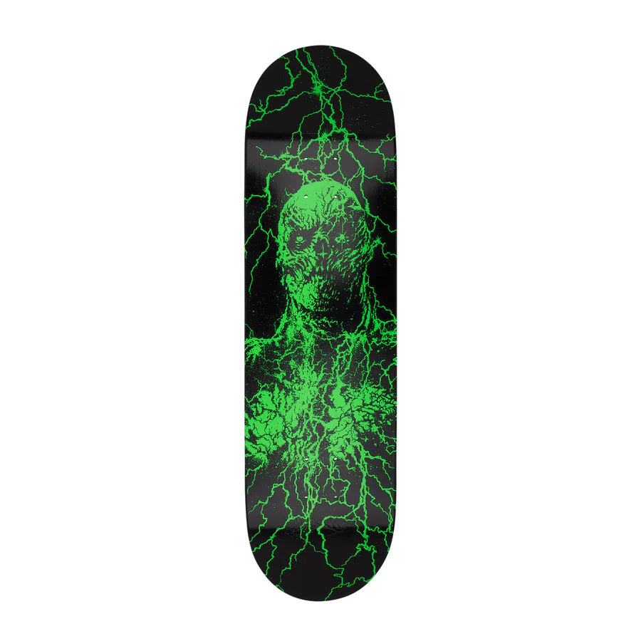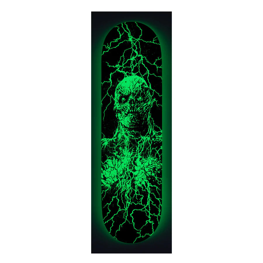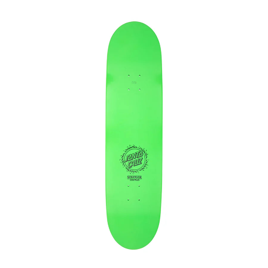 The Santa Cruz Stranger Things Vecna 8.5in x 32.2in Santa Cruz deck features green glow in the dark Vecna graphics on the bottom of a fully dipped classic glow in the dark green 8.5 Santa Cruz deck.